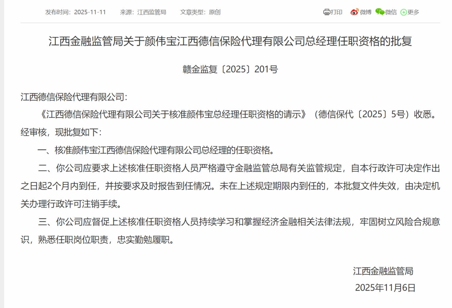 11月11日最好的股票配资网站,江西金融监管局关于颜伟宝江西德信保险代理有限公司总经理任职资格的批复,核准颜伟宝江西德信保险代理有限公司总经理的任职资格。